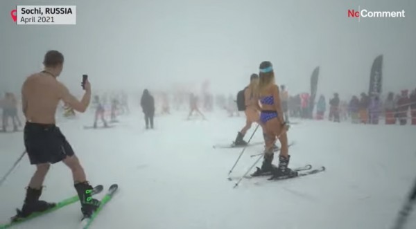 Shumica e pjesëmarrësve dolën në pistat e skive me kostume noti, pantallona të shkurtra dhe bikini, pa maska mbrojtëse kundër Covid-19.