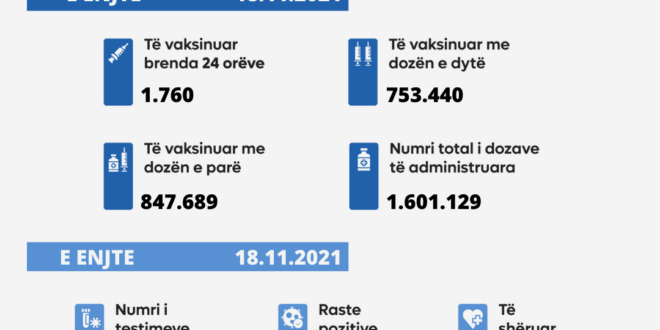 Në 24 orët e fundit janë dhënë 1.760 doza të vaksinës kundër COVID-19. Prej fillimit të vaksinimit në të gjitha qytetet e Kosovës janë dhënë 1.601.129 doza të vaksinës. Deri më sot 753.440 qytetarë janë vaksinuar me dozën e dytë.