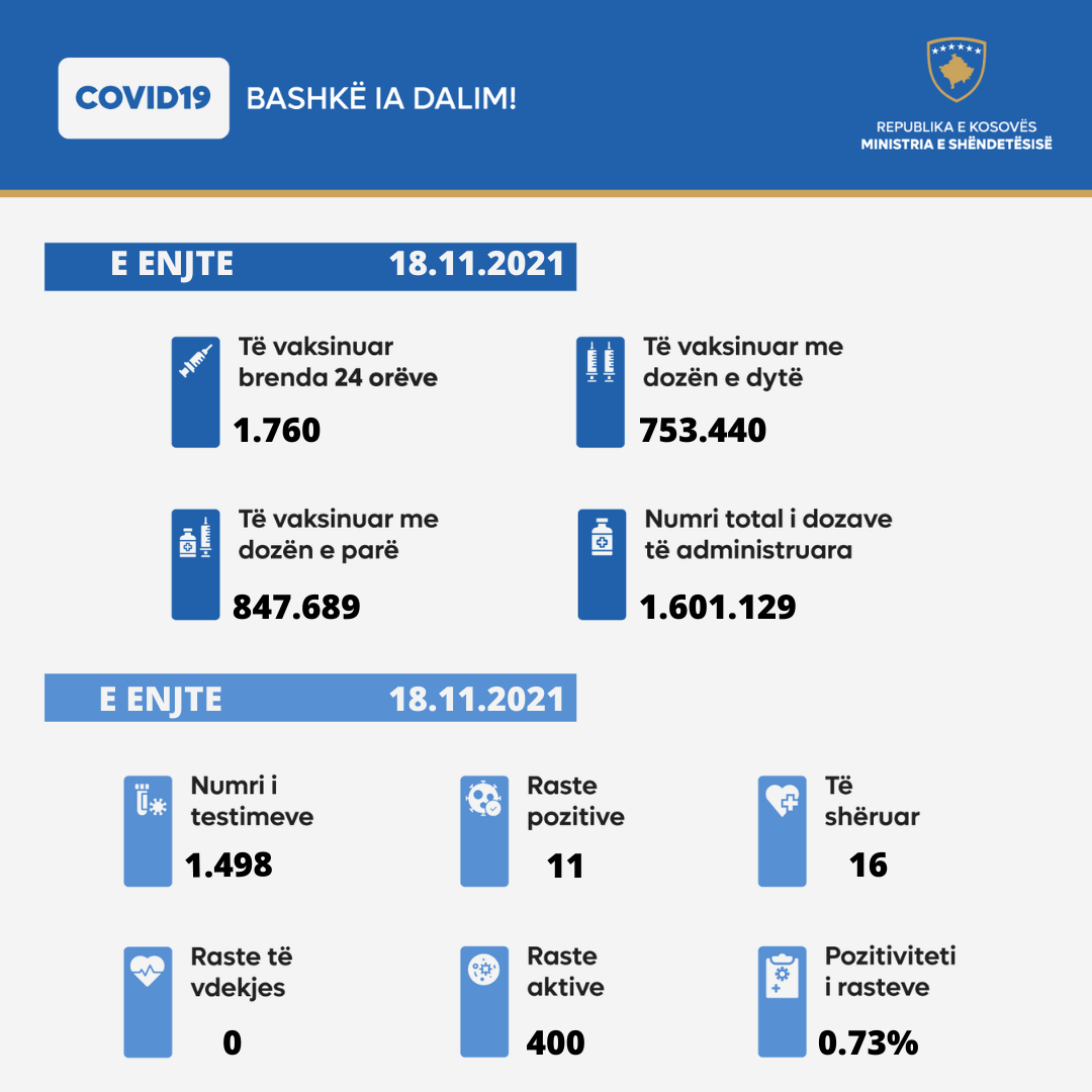 Në 24 orët e fundit në Kosovë janë regjistruar 11 raste të reja me koronavirus nga 1.498 testime të kryera.