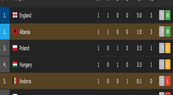 1.Anglia – 3 pikë2.Shqipëria – 3 pikë 3.Polonia – 1 pikë4.Hungaria – 1 pikë 5.Andorra – 0 pikë6.San Marino – 0 pikë/KP