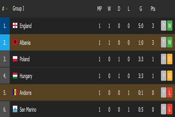 Me këto fitore, Anglia shkaku i golaverazhit gjendet në vendin e parë, me pikë të njëjta sa ka edhe Shqipëria në vendin e dytë, kurse Hungaria dhe Polonia kanë nga një pikë në pozitat tre dhe katër, dhe Andorra me San Marinon me dy humbjet e sotme kanë zero pikë.