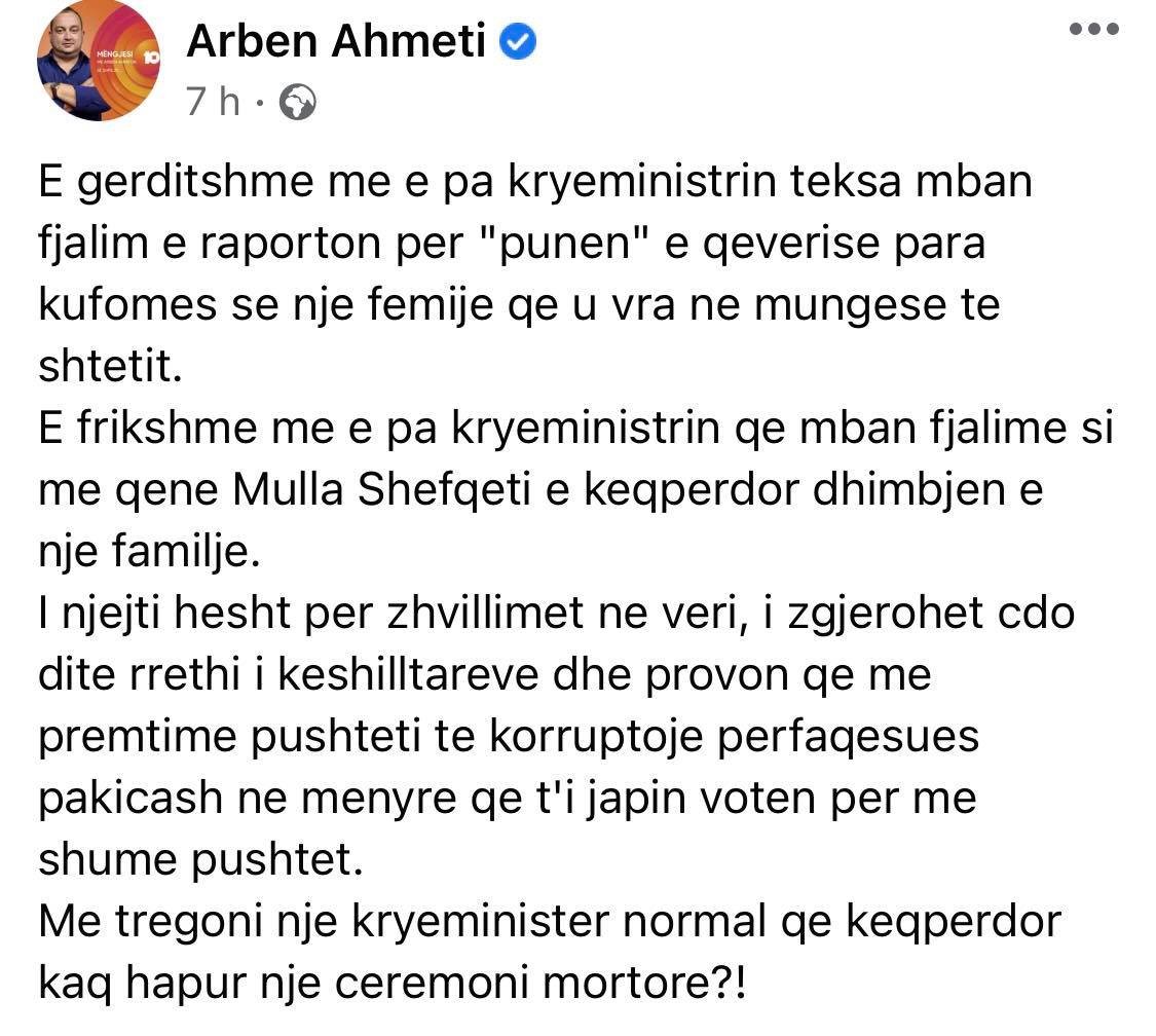 Gazetari Arben Ahmeti në një postim në facebook ka kritikuar Kryeministrin Kurti në lidhje me fjalimin që mbaji sot gjatë varrimit të 18 vjeçares nga Ferizaji./DielliNews.info
