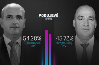 Ekrem Hyseni i Lidhjes Demokratike të Kosovës e ka fituar Podujevën, sipas EXIT-POLL-it të realizuar nga Tomor Qela dhe të prezantuar ekskluzivisht në Klan Kosova. Ekrem Hyseni i LDK-së ka fituar me një përqindje prej 8.54% të votave, duke marrë 54.28%, derisa kundërkandidati i tij, Shpejtim Bulliqi nga Lëvizja Vetëvendosje ka marrë 45.72% Rezultatet e këtij EXIT POLL-i të prezantuar në Klan Kosova: Ekrem Hyseni (LDK): 54.28% Shpejtim Bulliqi (VV): 45.72 %/Express ...