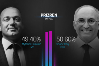 Shaqir Totaj i PDK-së ka fituar Prizrenin me 50.60 përqind, sipas EXIT POLL-it të prezantuar në Klan Kosova. Ndërkaq, Mytaher Haskuka i Vetëvendosjes ka 49.40 përqind, njofton Klan Kosova. Ky EXIT POLL është i realizuar me margjinë të gabimit më të vogël se 3 përqind. ...