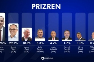 Qytetarët e Kosovës sot kanë votuar në zgjedhje lokale. Sipas EXIT POLL-it të realizuar nga RTV Dukagjini dhe kompania UBO-Consulting del që në Komunën e Prizrenit do të ketë balotazh Renditja si më poshtë: Mytaher Haskuka (LVV)- 38.9% Shaqir Totaj (PDK)- 29.7% Anton Quni (LDK)- 18.9% Zafir Berisha (NISMA)- 5.3% Lulzim Kabashi (AAK)- 4.2% Rezultatet e Exit Poll kanë dalë nga qytetarët e pyetur për zgjedhjen e tyre politike në ditën e sotme, duke ruajtur anononimitetin ...