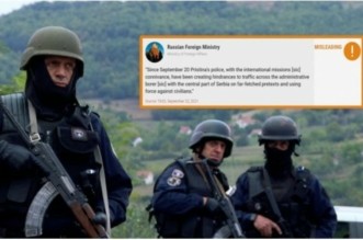 Kjo deklaratë, e publikuar në agjencinë e lajmeve ruse “TASS”, thekson se “që nga 20 shtatori, policia e Prishtinës, me pëlqimin e misioneve ndërkombëtare, ka krijuar pengesa në trafikun përgjatë kufirit administrativ me pjesën qendrore të Serbisë, me pretekste të largëta dhe duke përdorur forcë kundër civilëve.” Platforma Polygraph e cila merret me verifikimin e lajmeve dezinformuese të shpërndara botërisht, ka botuar një artikullqë e konsideron si “mashtruese” ose “çorientuese” një deklaratë të Ministrisë së Jashtme ruse. Kjo deklaratë, e publikuar në agjencinë e lajmeve ruse “TASS”, thekson se “që nga 20 shtatori, policia e Prishtinës, me pëlqimin e misioneve ndërkombëtare, ka krijuar pengesa në trafikun përgjatë kufirit administrativ ...