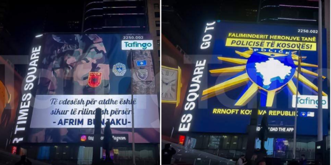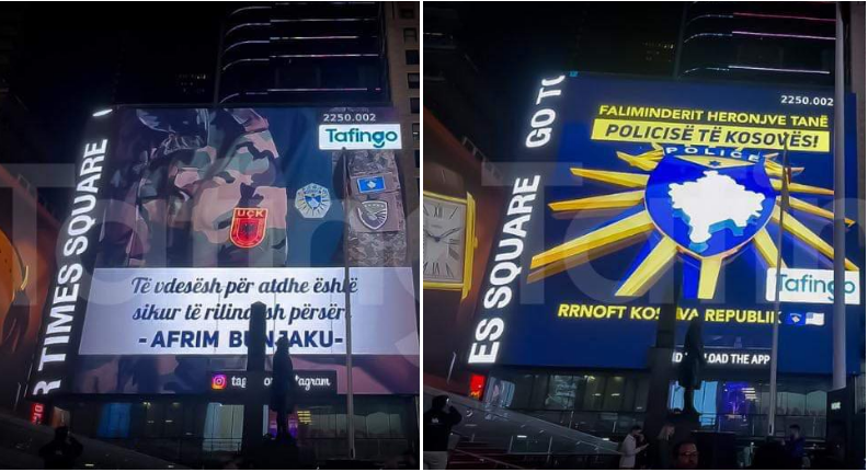 “Të vdesësh për atdhe është sikur të rilindësh përsëri -Afrim Bunjaku”, “Faleminderit heronjve tanë Policisë të Kosovës”, janë mesazhet që janë shfaqur në Times Square.
