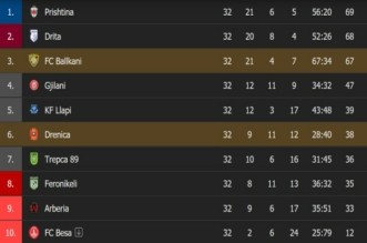 Komentet te Superliga e Kosovës, tabela pas 32 xhirosh dhe ndeshjet e mbetura për Prishtinën, Dritën e Ballkanin Janë të Mbyllura