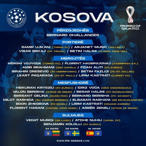 Përzgjedhësi i Kombëtares së Kosovës, Bernard Challandes e ka publikuar listën e futbollistëve të ftuar për tri ndeshjet e këtij muaji; miqësoren kundër Lituanisë, më 24 mars dhe dy duelet kualifikuese për Botërorin “Katari 2022” kundër Suedisë, më 28 mars dhe kundër Spanjës, më 31 mars.