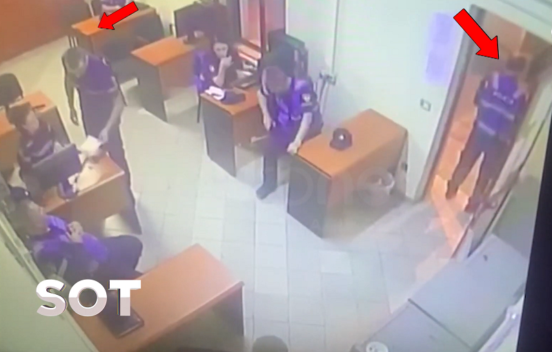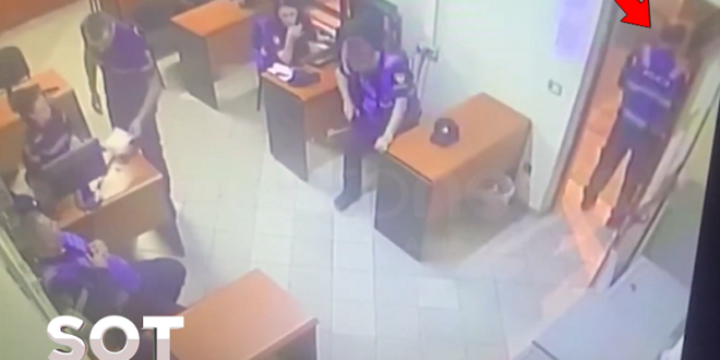 Ky i fundit përpiqet të largohet duke u futur përsëri brenda në Komisariat e duke shtyrë me këmbë derën që të largonte 25-vjeçarin i cili shihet teksa e ndjek me armë në dorë deri tek dera.