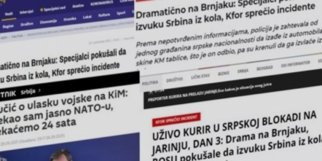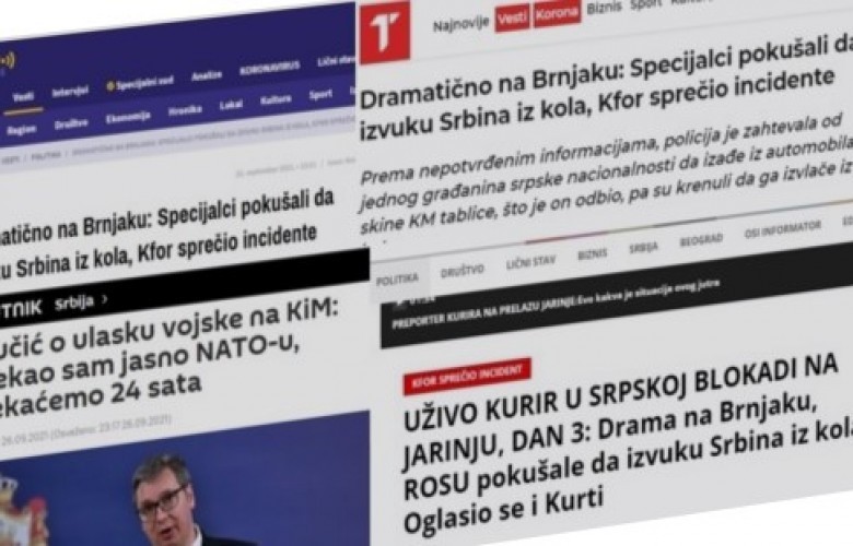 Tituj sensacional apo edhe tendencioz janë përdorë në vazhdimësi nga media që kishin për qëllim propagandën dhe dezinformimin. Gjithashtu, dezinformata që synonin për të dramatizuar situatat haseshin te mediet serbe “Kosovo Online”, “Sputnik Serbia”, etj. “Kosovo Online” kishte tituj të tillë si “Dramatike në Bërnjak: Forcat speciale u përpoqën të nxirrnin një serb nga vetura, KFOR parandaloi incidentet”, sikurse edhe media tjetër serbe, “Telegraf”, ndërkaq te “Sputnik Serbia”, media që kontrollohet nga Rusia, publikoheshin dezinformata me tituj: “Vuçiq për hyrjen e ushtrisë në KiM: I thashë qartë NATO-s, do të presim 24 orë”, “Dramë në Bërnjak: Forcat ROSU rrahën tre serbë”, etj. Fjalën ‘dramë’ e përdorën edhe gazetarë të tjerë në Serbi, sikurse rasti i “Kurir”: “Dita 3: Dramë në Bërnjak, ROSU u përpoq të nxirrte një serb nga makina!”.