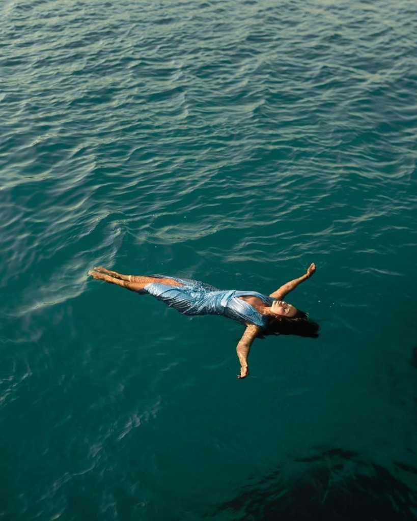 Në ato imazhe, Elvana shfaqet duke kërcyer në det, teksa në foton e fundit shfaqet e shtrirë në ujë.