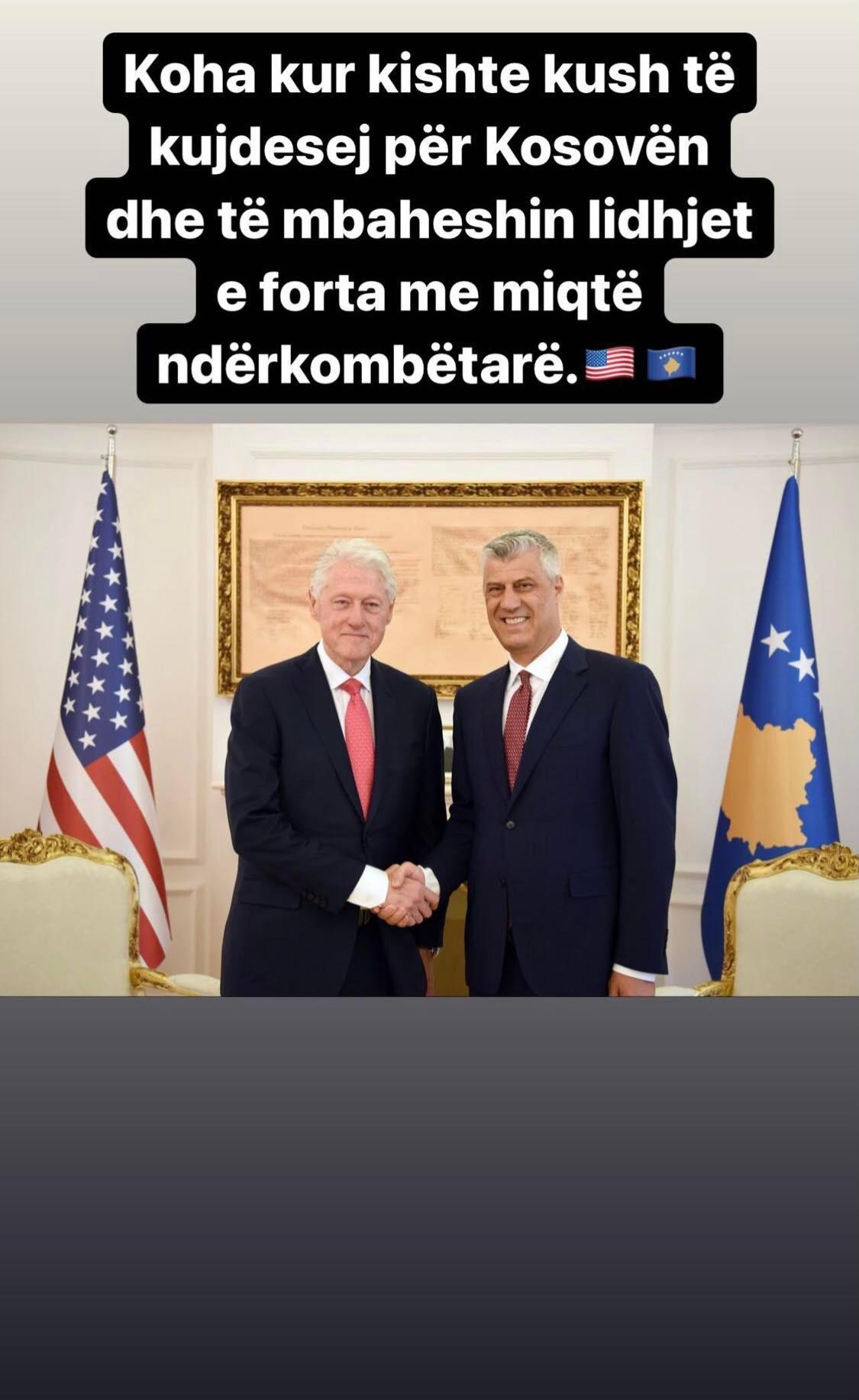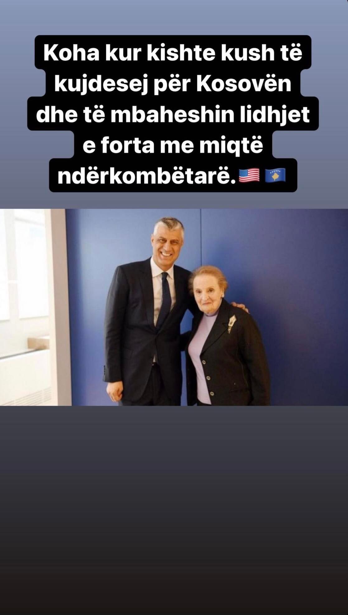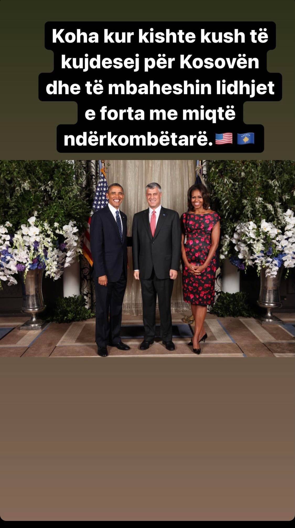 Djali i ish-Presidentit Hashim Thaçi,   Endrit Thaçi  në llogarinë e tij në instagram ka postuar disa fotografi të ish- Presidentit Thaçi me miqët ndërkombëtarë, në këto fotografi ka një mbishkrim ”Koha kur kishte  kush të kujdesej për Kosovën dhe të mbaheshin lidhjet e forta me miqët ndërkombëtarë”,ka shkruar ai./DielliNews.info
