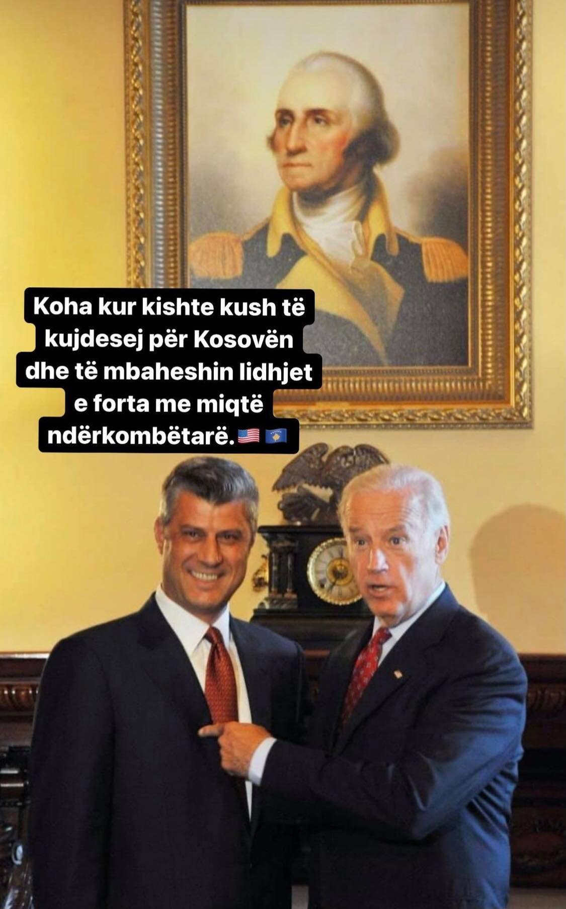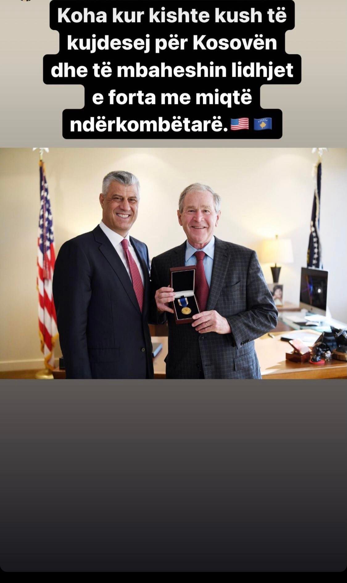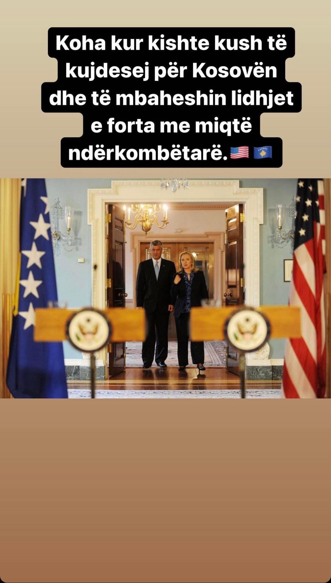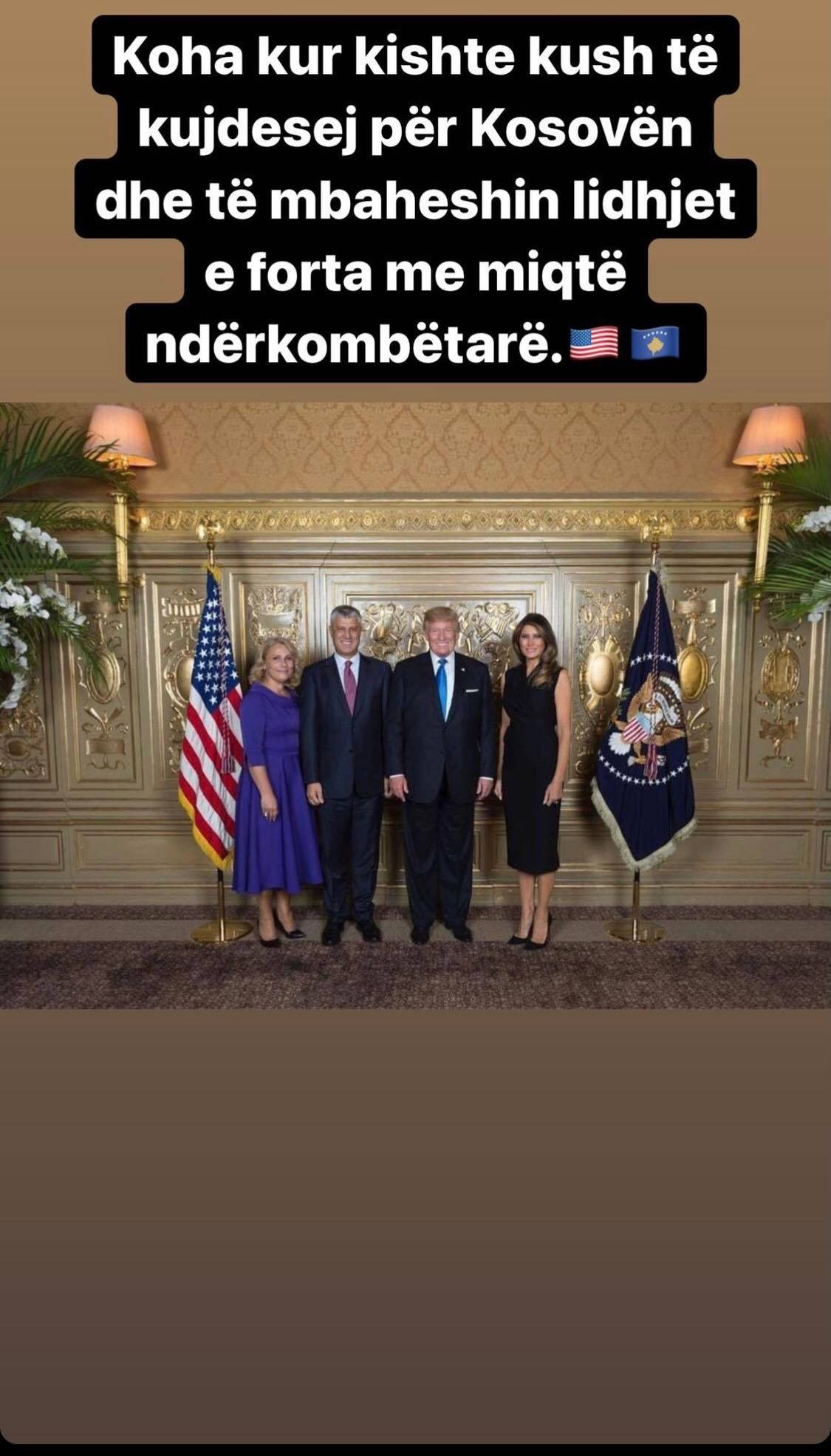 Djali i ish-Presidentit Hashim Thaçi,   Endrit Thaçi  në llogarinë e tij në instagram ka postuar disa fotografi të ish- Presidentit Thaçi me miqët ndërkombëtarë, në këto fotografi ka një mbishkrim ”Koha kur kishte  kush të kujdesej për Kosovën dhe të mbaheshin lidhjet e forta me miqët ndërkombëtarë”,ka shkruar ai./DielliNews.info