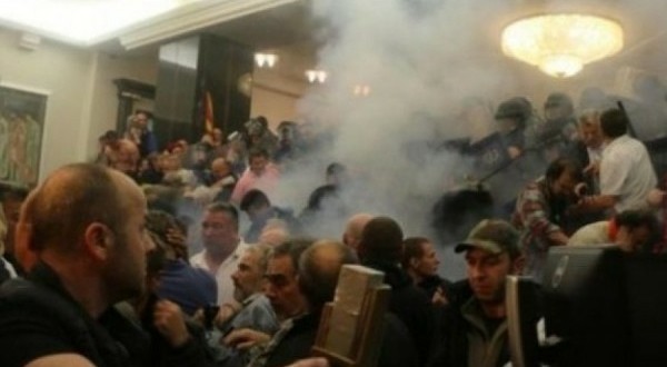 Rreth dy orë në sallën e mediave në katin e parë disa deputetë, në mesin e të cilëve edhe kryeministri asokohe i ardhshëm Zoran Zaev dhe kryeparlamentari i sapozgjedhur Talat Xhaferi janë nën rrethim dhe goditje nga turma e qytetarëve. Zyrtarisht, mbi 100 persona përfundojnë në spital, ndërsa më kritike ishte gjendja e deputetit Ziadin Sela.
