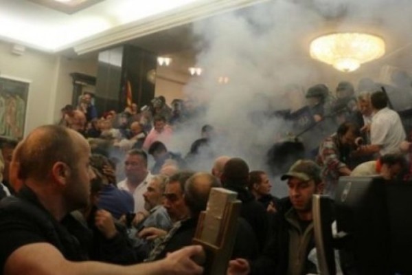 Përderisa zgjatë konferenca për media e Talat Xhaferit në monitorët deputetët dhe gazetarët shikojnë se si një turmë qytetarësh depërton rrethojën mbrojtëse të kordonit policor dhe vjen deri te dyert e Kuvendit. Derisa flet Zaevi, turma tashmë hyn në Kuvend dhe sigurimi i mbyll dyert e sallës për media.