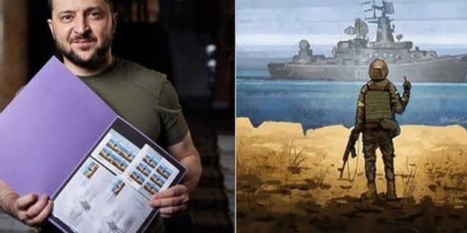 Në këtë pullë postare shihet ushtari ukrainas duke ia treguar gishtin e mesëm “Moskvës”, tashmë anijes së fundosur që konsiderohej si krenaria e flotës ruse