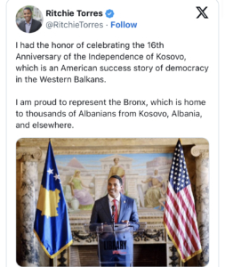 “Kam pasur nderin të festoj 16-vjetorin e Pavarësisë së Kosovës, që është një histori suksesi i Amerikës për demokracinë në Ballkanin Perëndimor. Jam krenar që përfaqësoj Bronksin, i cili është shtëpia e mijëra shqiptarëve nga Kosova, Shqipëria dhe gjetkë”, ka shkruar Torres.