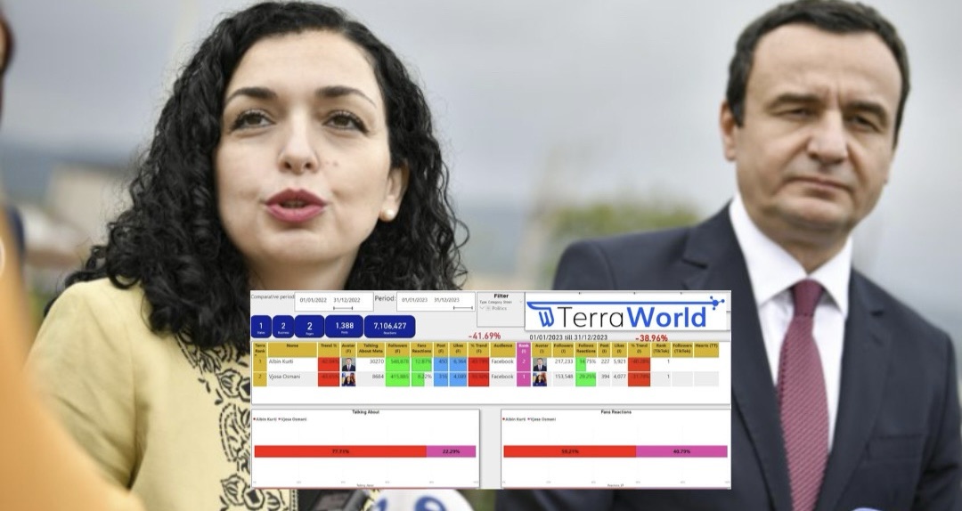Në llogarinë e tij në Facebook dhe Instagram, kryeministri Albin Kurti ka trend negativ prej -43.79% në krahasim me vitin aktual, ndërsa presidentja Vjosa Osmani ka një trend shumë negativ prej -55.50% në raport me vitin paraprak, përcjell Demokracia.com.