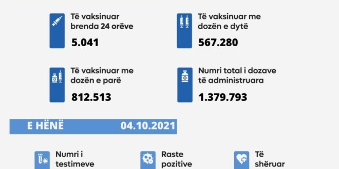04 Tetor 2021: Ministria e Shëndetësisë, sipas të dhënave nga Instituti Kombëtar i Shëndetësisë Publike të Kosovës, informon: