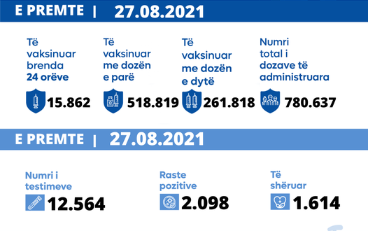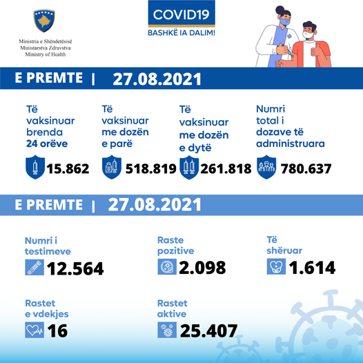 Nga 12.564 testime, 2.098 qytetarë kanë rezultuar pozitiv me virusin COVID-19.