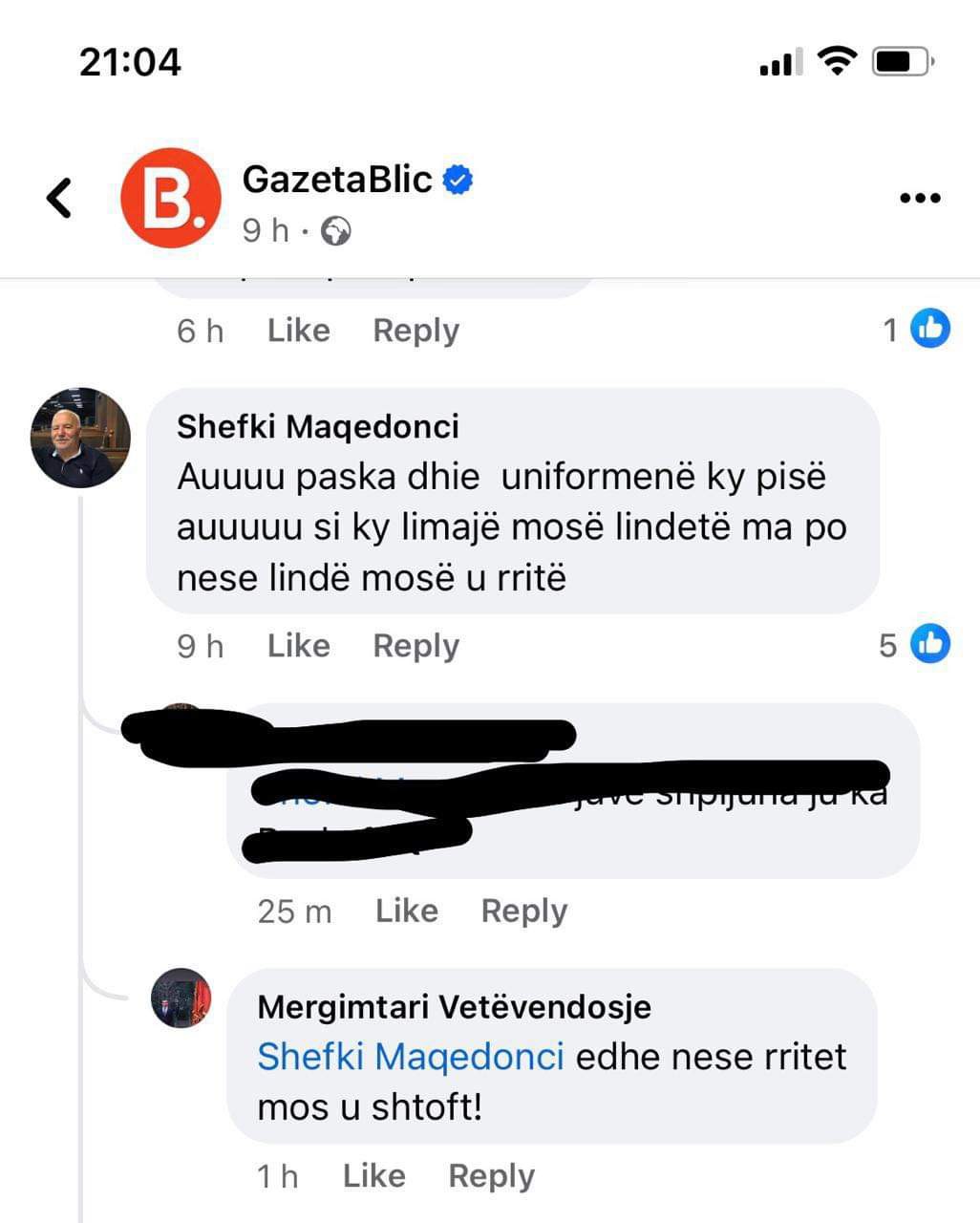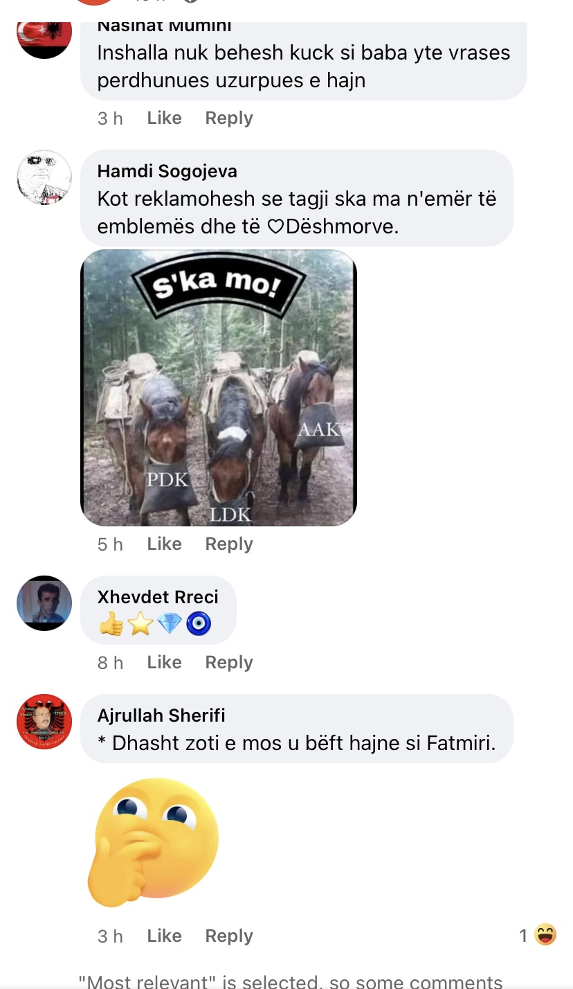 Mallkime e ofendime të shumta mund të shohim në komente nga shumë militantë. Madje disa prej tyre kanë foton të Vetëvendosjes në profilin e tyre.