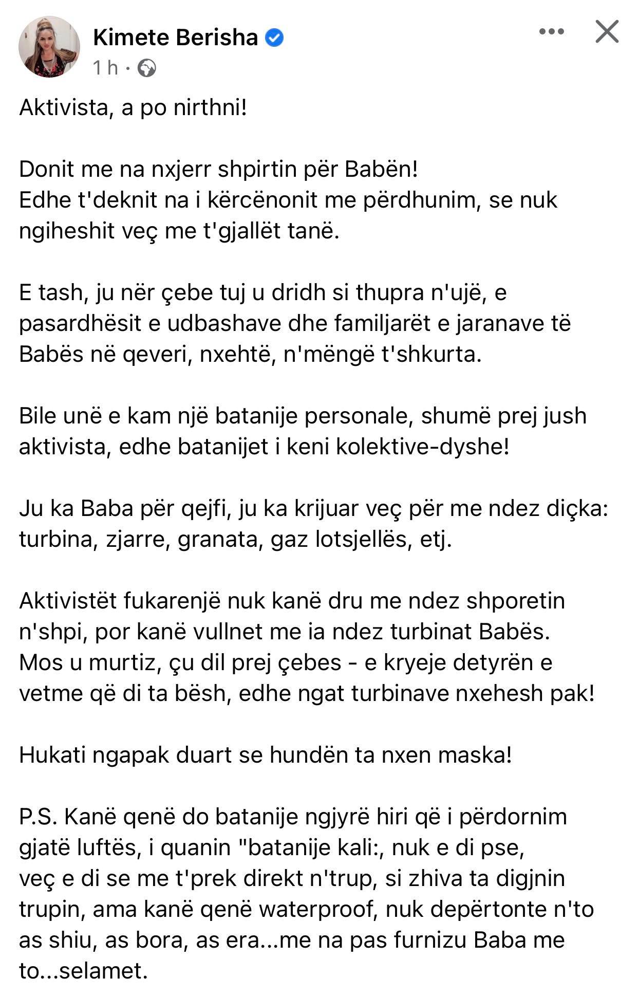Më poshtë gjeni postimin e plotë të Kimete Berishës: