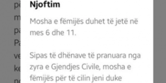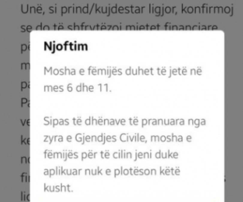 Në njoftimin e platformën e-Kosova, lexueses në fjalë i është thënë se “mosha e fëmijës duhet të mes 6 dhe 11 vjet. Sipas të dhënave të pranuara nga zyra e Gjendjes Civile, mosha e fëmijës për të cilin jeni duke aplikuar nuk e plotëson këtë kusht”.
