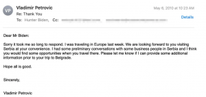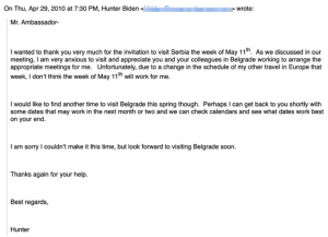 Shkrimet elektronike tregojnë se Mark Doyle, që më parë kishte shërbyer si këshilltar i lartë për Joe Bidenin, atëherë senator, dhe si drejtor për financa kombëtare në kandidaturën e pasuksesshme të Bidenit për president më 2008, kishte vënë kontakte me Hunter-in më 16 prill 2010, për t’i thënë se ishte takuar me shefin e stafit të presidentit të atëhershëm serb dhe se ata kishin pyetur për shprehjen e interesit të Bidenit të ri për organizimin e një takimi.
