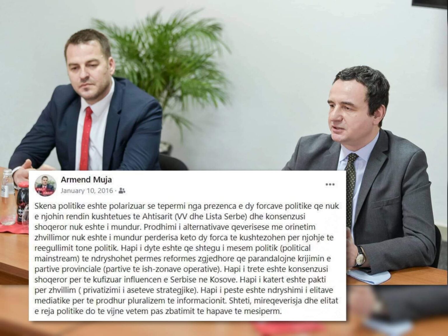 Koha kur Muja e kishte shkruar këtë status ishte fillimi i vitit 2016, një kohë e tensioneve dhe polarizimeve të mëdha politike, në ballë të të cilave qëndronte Lëvizja Vetëvendosje dhe Albin Kurti.