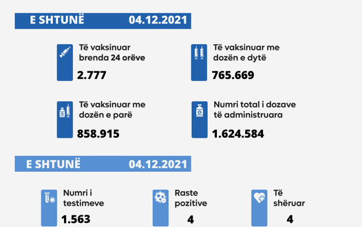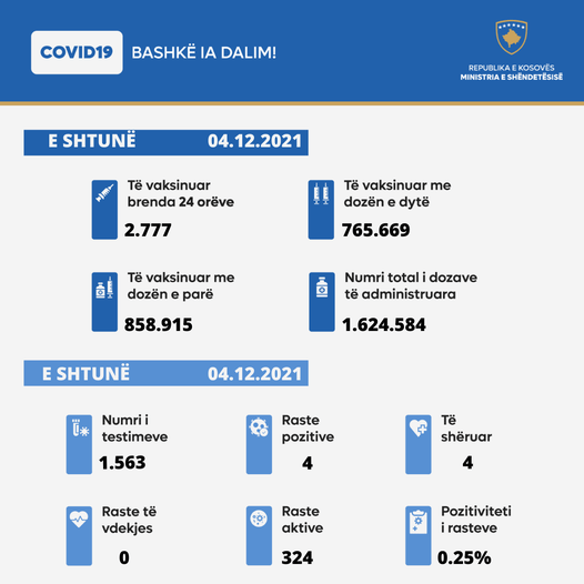 Nga 1.563 testime, 4 qytetarë kanë rezultuar pozitiv me virusin COVID-19.