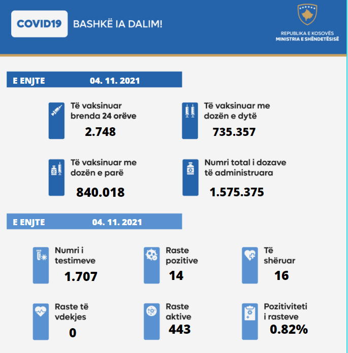 Nga 1.707 testime, 14 qytetarë kanë rezultuar pozitiv në COVID-19.