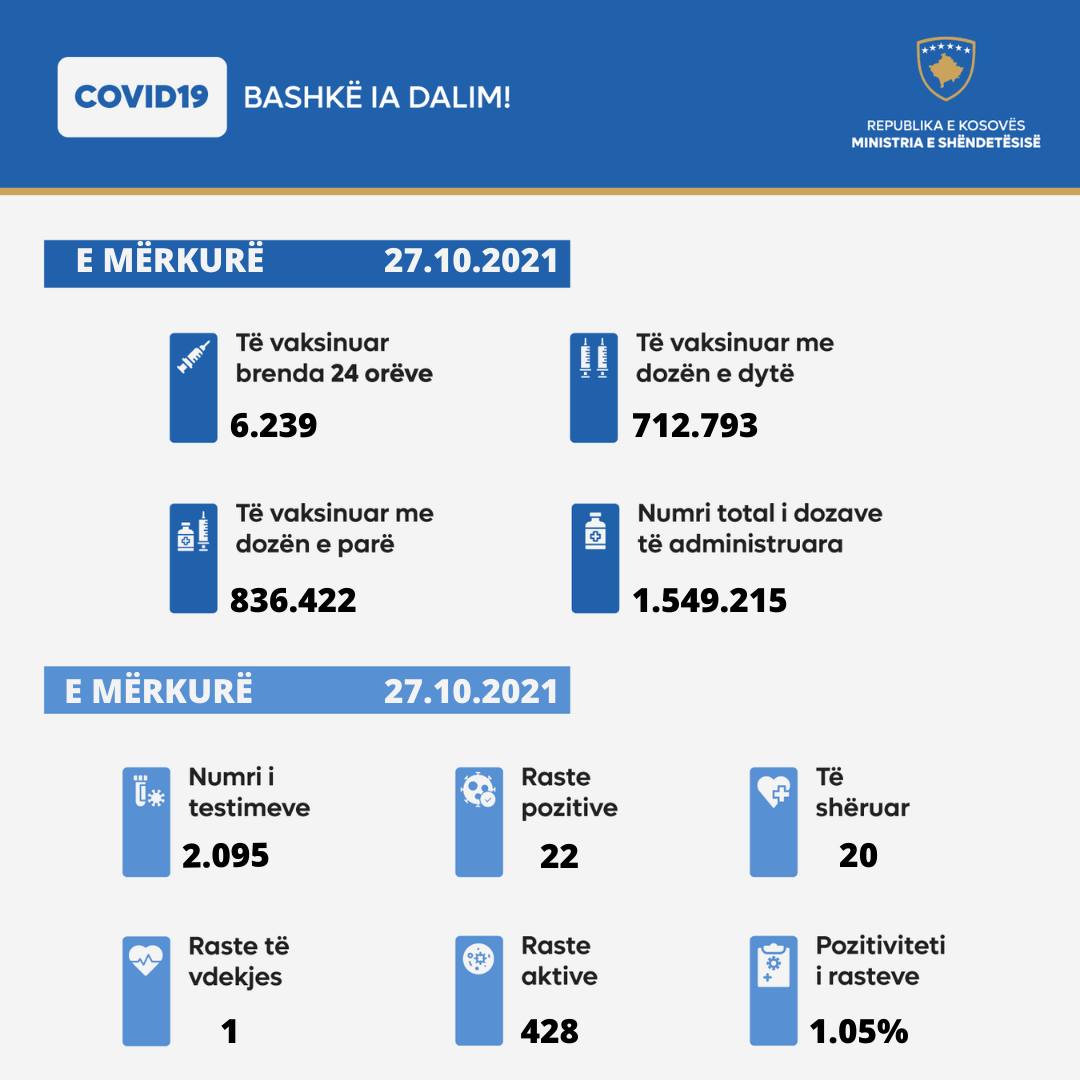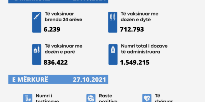 27 Tetor 2021: Ministria e Shëndetësisë, sipas të dhënave nga Instituti Kombëtar i Shëndetësisë Publike të Kosovës, informon: