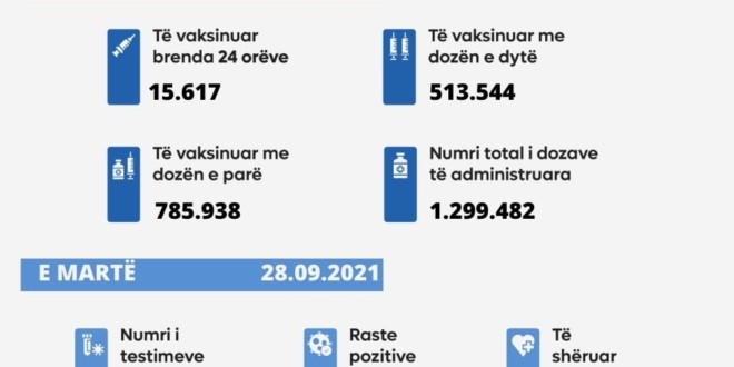 28 Shtator 2021: Ministria e Shëndetësisë, sipas të dhënave nga Instituti Kombëtar i Shëndetësisë Publike të Kosovës, informon: