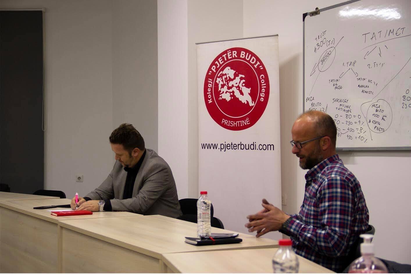 Rektori i Kolegjit “Pjeter Budi” Prof.Ass.Dr.Artan Haziri, mirëpriti z.Adritatik Stavileci në debatin me studentët me temën: “Ndikimi i doganave në ekonominë e Kosovës”