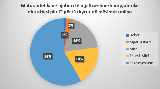 58% e maturantëve mendojnë se kanë aftësi të shkëlqyeshme për t’u kyqur në mësimet e tyre online, 19% e respodentëve mendojnë që kanë aftësi shumë të mira, dhe 19% aftësi të mira per t’u kyqur online, ndersa 3% aftësi të mjaftueshme dhe vetëm 1% kanë aftësi të dobëta per t’u kyqur online. DielliNews.info