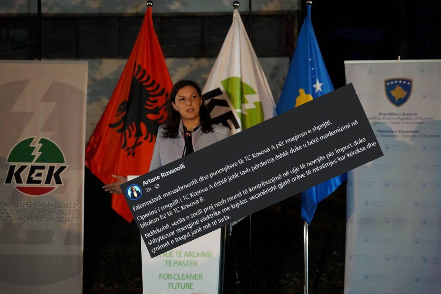 “Falemnderit menaxhmentit dhe punonjësve të TC Kosova A për reagimin e shpejtë. Operimi i rregullt i TC Kosova A është jetik tash përderisa është duke u bërë modernizimi në bllokun B2 të TC Kosova B. Ndërkohë, secila e secili prej nesh mund të kontribuojmë në ulje të nevojës për import duke shfrytëzuar energjinë elektrike me kujdes, veçanërisht gjatë orëve të mbrëmjes kur këreksa dhe çmimet e tregut janë më të larta.”, kishte shkruar Rizvanolli në postimin e saj.