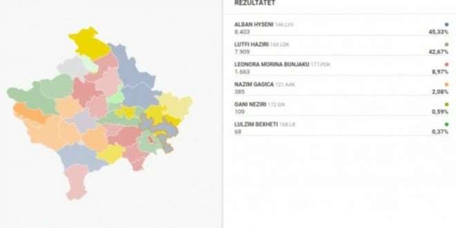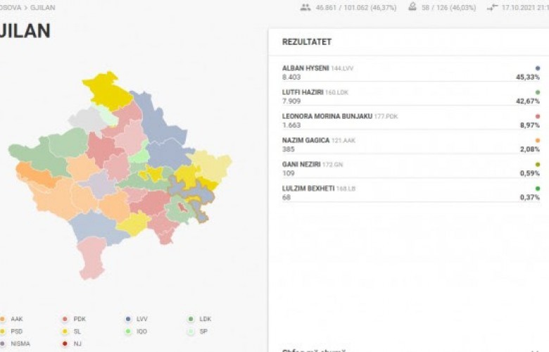 SIPAS KQZ-SË EDHE GJILANI NË BALOTAZH By Dielli.info - 17 Tetor, 2021 - in Lajme Mbi 46 për qind e votave tashmë janë numëruar në Gjilan Teksa kandidati i LVV-së, Alban Hyseni prin me mbi 45 për qind të votave, i pasuar nga ai i LDK-së, Lutfi Haziri me 42 për qind të votave. Kështu që Gjilani si duket do të shkojë në balotazh.