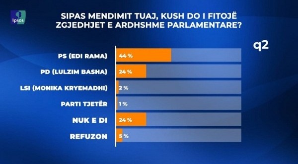 Ndërsa 24% mendojnë se do i fitojë PD me kryetar Lulzim Bashën, vetëm 2% mendojnë se do i fitojë LSI me kryetare Monika Kryemadhin.