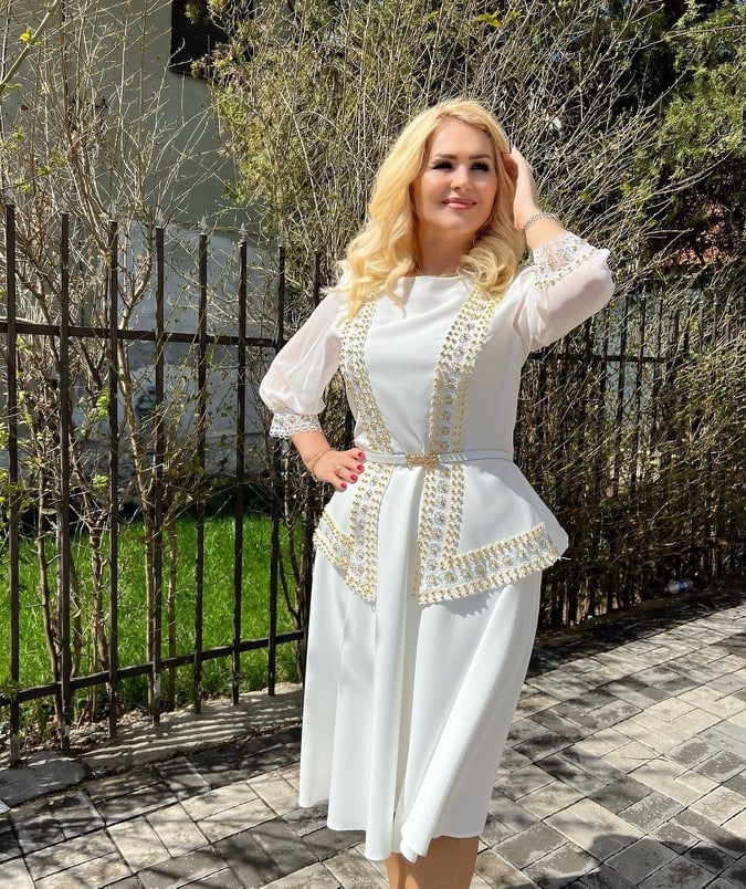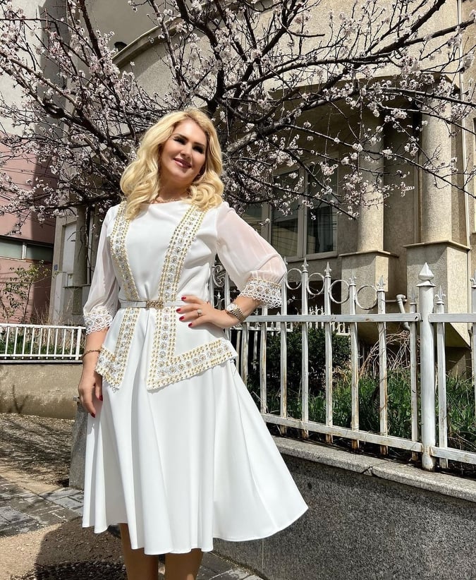 E rregulluar bukur dhe e veshur me fustan të bardhë e bluzën me qepje me dorë, Shyhretja po duket një zonjë e vërtetë.